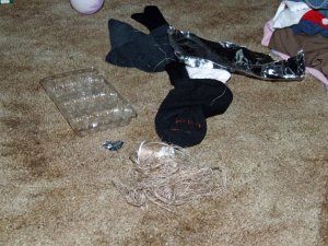 I know you will appreciate this one. Last night, I am guessing on the order of events here, Pippi ate three girl scout cookies and lost her mind. She climbed onto the coffee table and knocked everything off, climbed onto the end table and tore up drier sheets, climbed onto my sewing table and went medieval on a spool of thread. Based on what we found this morning I have to assume this is what happened.
