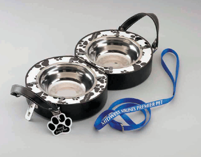 I received the neatest Birthday Gift from my friend Jeff. He works for Midwest Airlines, one of the people I travel with. Well he has had to hear about my love of dogs a time or two and as a special surprise he game me a little Midwest swag. A travel bowl set that had the Midwest logo on the front.