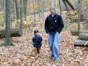 With Lynn and Lloyd still with us on the Lincoln truck there was a little leeway to go see Zach in Indiana. We drove most of the way there and stopped in after they were home from church on Sunday. Sweet little Elizabeth was all smiles, Dorothy did all her funny voices and as always Derrick was hilarious. He is so creative and has a wild imagination. A true farm boy he gathered eggs from his chickens and told us about the baby chicks that were still in their eggs. All of this pretend of course. When pulling up to the house it was pretty easy to tell which one was theirs. A backyard with a peddle tractor and three peddle cars gave it away. Pippi spent the day being chased by their lab Hunter and after getting some of Jill’s chili for lunch we went for a walk. Zach took us to the Pioneer Mothers Preserve, an old growth forest. We goofed around a bit but had a great time.