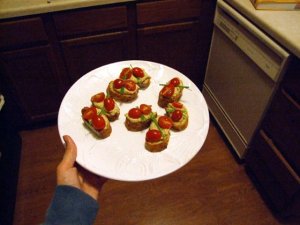 These are hors d’oeuvres I made for New Years, toasted asiago and sun dried tomato baguette with my homemade hummus and cherry tomatoes. A little pinch of chives for effect.