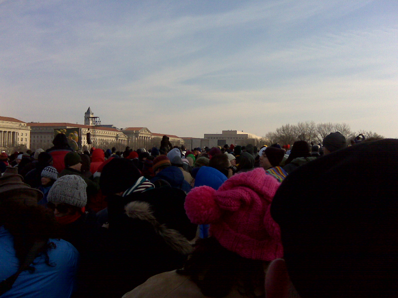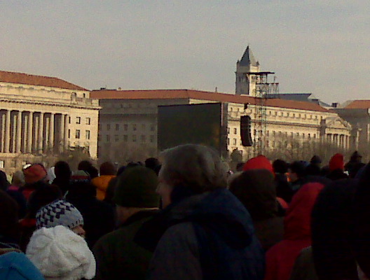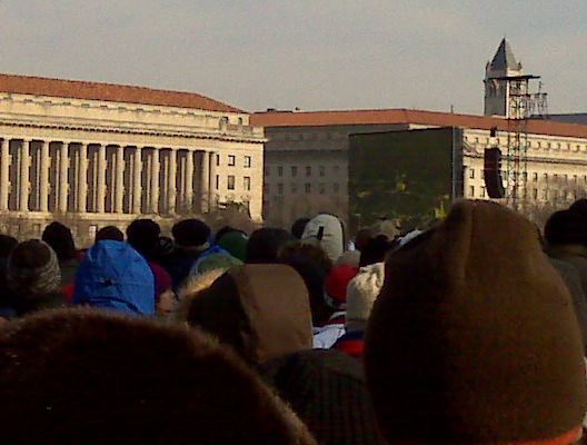 Well we drugged through the street filled with over a million people and ran with crowds to find a spot to stand on the National Mall to watch the swearing in of our 44th President. It was a powerful and beautiful moment to be surrounded by fellow Americans there were all there to support the new administration and to support each other. The cold in the air seamed to disappear when Obama’s speech started. I was filled with a sense of brotherhood and hope that he will accomplish those tasks set forward in his words. As we filed out into the streets it was a mad house but not a single soul was hasty or rude. We all just moved together. The closed off streets were filled with singing and dancing, even as the temperature dropped the air was still filled with electricity. We will be posting more stories and pictures this week.