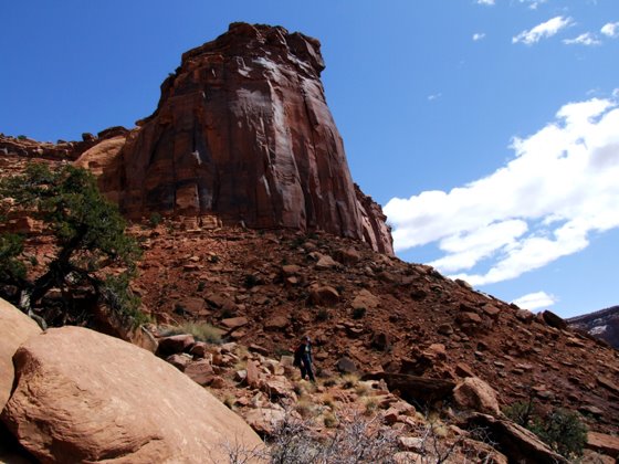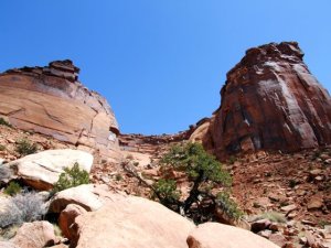 Canyonlands is a very large park and has three different sections to choose from, we went into the Needles district. The hiking was amazing but one of the most challenging hikes I have done. We basically went down the shear face of a canyon via switch back. By the time we reached the bottom my calves were howling. This was just the started, we had at least four more miles to go to find a camp site. What made this trip a truly unique experience for both of us was the camping, there are no marked campsites with fire rings and tent pads. This is at large, you have to be a mile off the trails and out of site. well what better way to be out of site then to tuck into another canyon. We found a great little spot with some wind protections, set up our new three man tent and settled in. Dinner was a freeze dried chili mac with tea and candy bars for dessert.