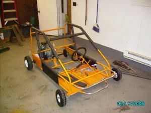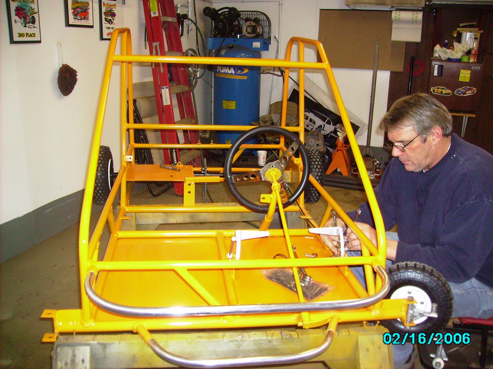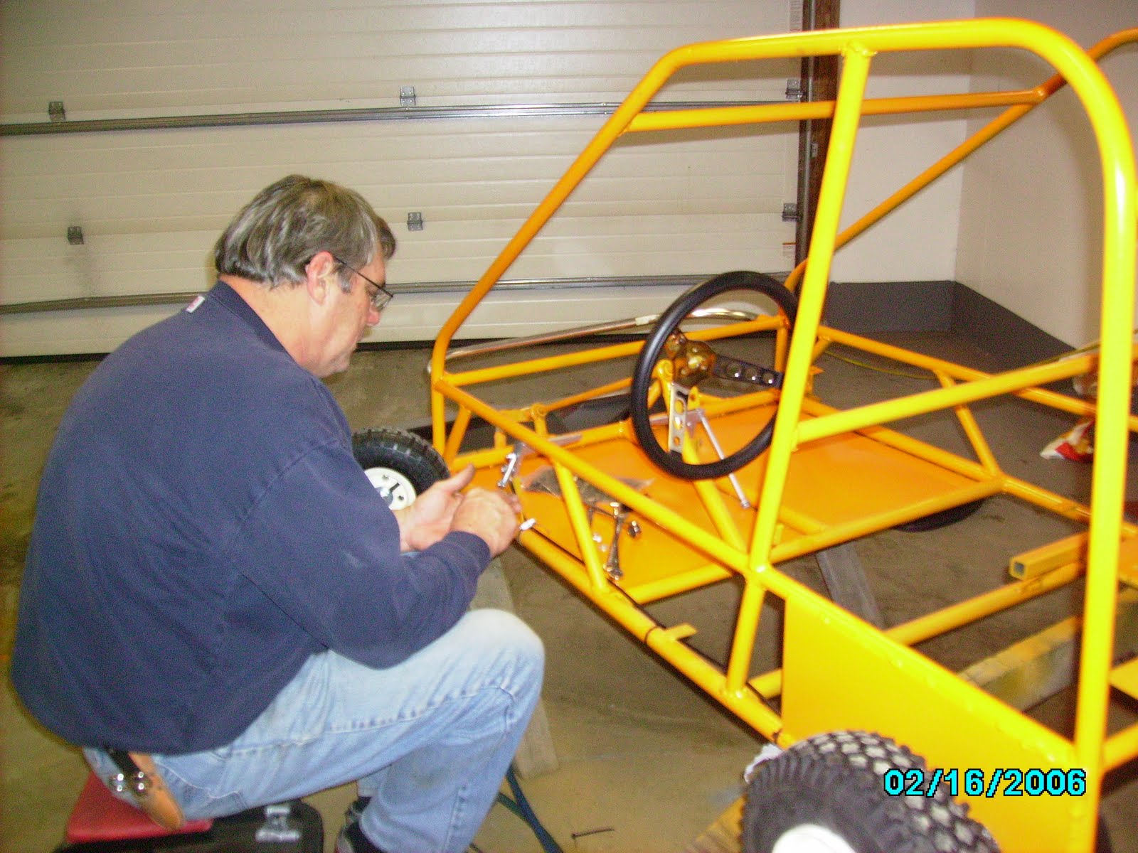 What is yellow and black and all over the floor, the paint for the wee hot rod!!!! So last weekend the go-cart was painted but as most projects go this one was not without problems. That one being the paint gun not functioning properly. I been told the color is more like an orange, they are thinking about naming it the Illini Kid. Derrick has a pedal car named the Illinois Kid.