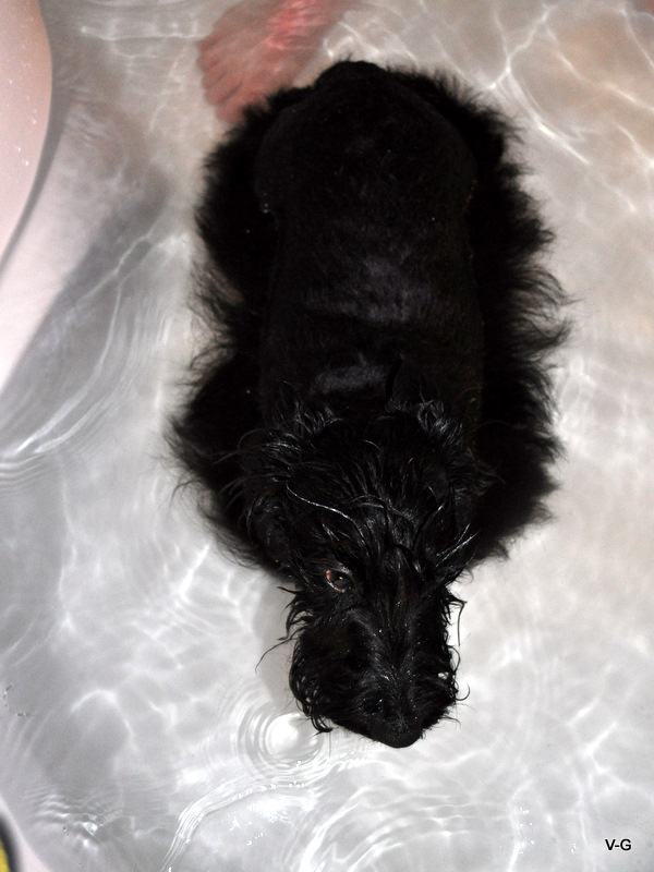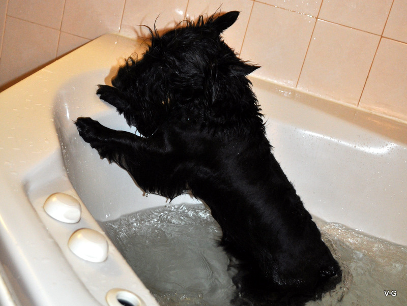 Spring is in the air, the grass is green and the lawns are full of goose poop!  To any of you out there with a Scottie this is a hazardous time of year.  Poop is fascinating but big stinky green goose poop is just so nice to roll in and try to eat.  Last night we got a special treat from walking Pippi, a lovely green gooey spot on our little princess.  With all that fun comes the worse thing in the world, A BATH.  Well not fun for P but sure is for us.  I just couldn’t resist taking this one, but enough laughing at the little wet dog. 🙂