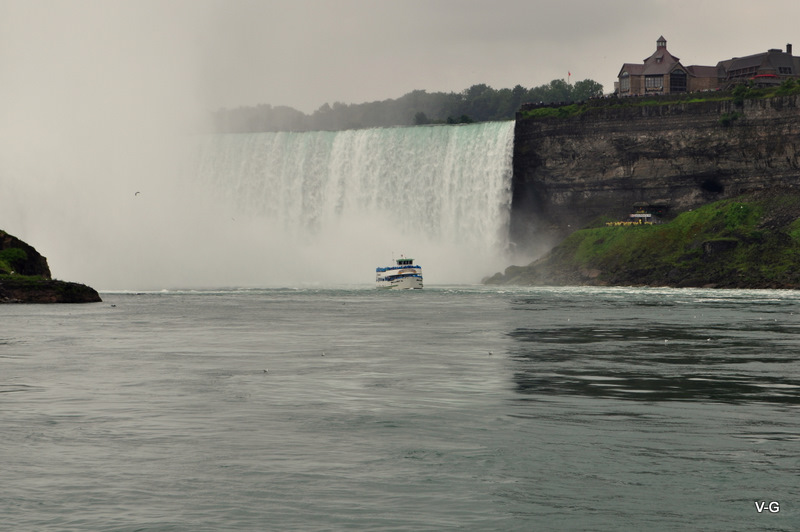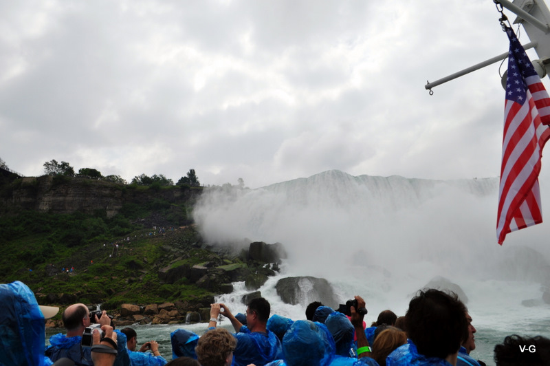 So there we were pushed into a crowd of other tourists not sure what this was going to be like.  As the boat rocked and lurched forward we headed for the Falls.  As we passed by the Bridal Veil Falls the mist sort of surprises us but it was fun, the roar started to come at that point.