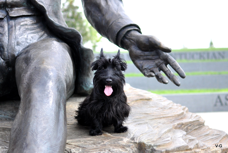 Honest Abe Lincoln sure looks a serious guy but the little Scottie next to him looks happy AND cute. She glad her peeps are reunited I guess.