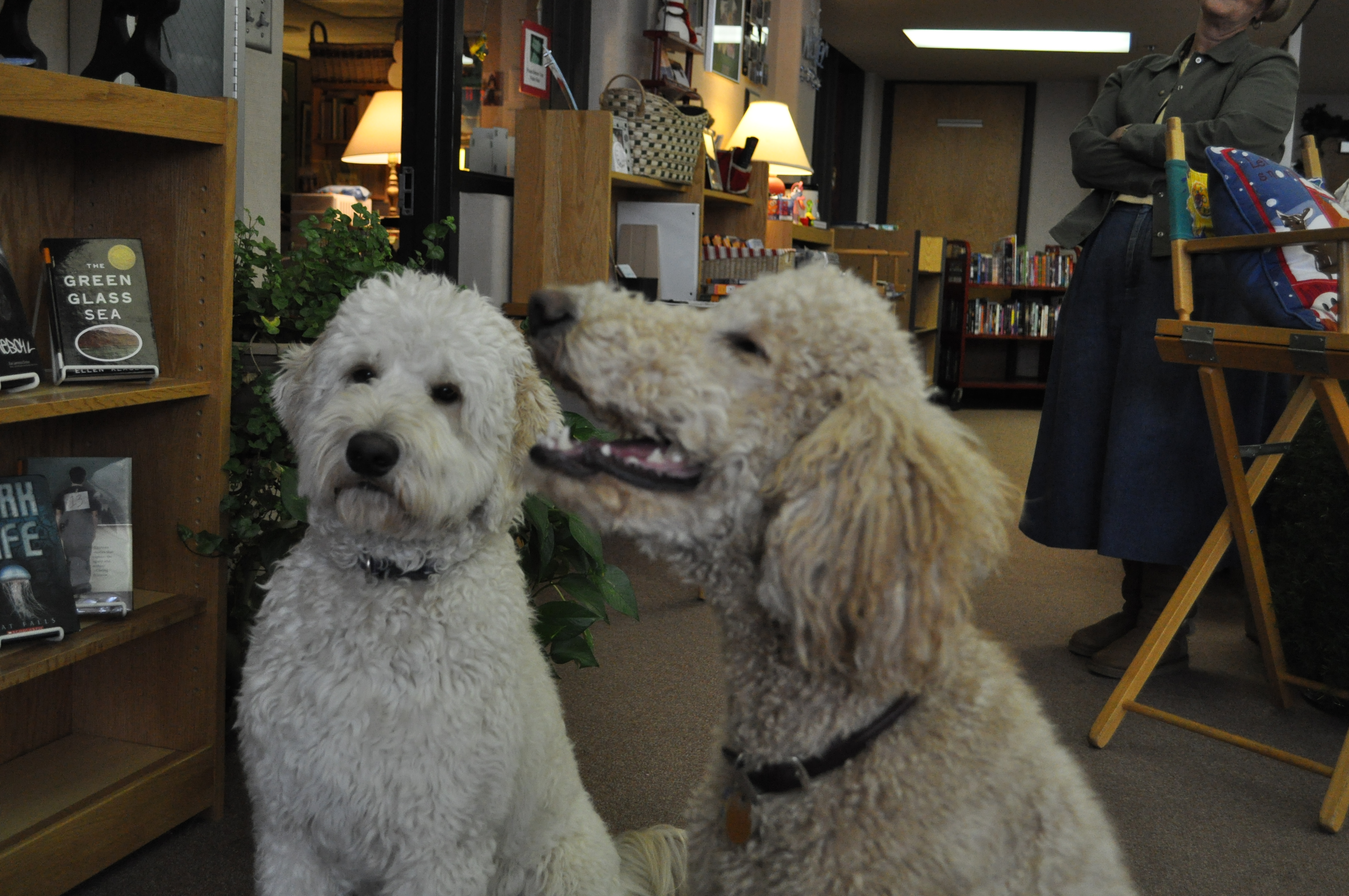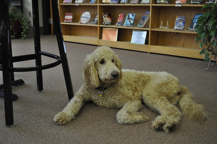 I want to introduce you to Bella and Jeter, two Golden-doodles with a very important job. They keep an eye and a warm paw on the students at North Side Middle School in Elkhart, IN. Dog in the library you say! Scandalous! Well what better place to have a warm furry body for students to visit? What better way to encourage students to use the library, can’t bribe them with candy why not use fur love? The entire thing started as a bit of an accident, Bella the old and darker Doodle, had some complications after spay surgery and spent the day at school with her Librarian. It was pretty instant the effect this gentle giant had on the kids. After that day Bella was a regular guest at the school library greeting kids and doing some doggy goodwill. She was really serving many rolls; easing the discomfort some children have towards dogs, giving kids a reason to stop in the library and for some being a best friend. She was soon joined by Jeter, her now partner in crime, and together they are ambassadors for the breed. Both of them have passed the AKC Good Citizenship class and you can tell they truly enjoy their work. At times they are a little goofy but always with a watchful eye on the students. Last February there was a bit of controversy over the dogs and they were asked to not come into school. To the surprise of the School Board and the Librarians, students took up a petition and flooded the board with letters asking to allow them back. Each letter was filled with a personal story of how the dogs had helped them through bad days or had made them like the library. It became pretty obvious that these dogs were an important part of the school and did the students immeasurable good. Jeter and Bella were invited back and have once again taken up the difficult role of helping kids.