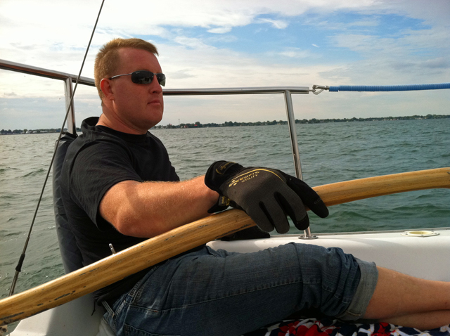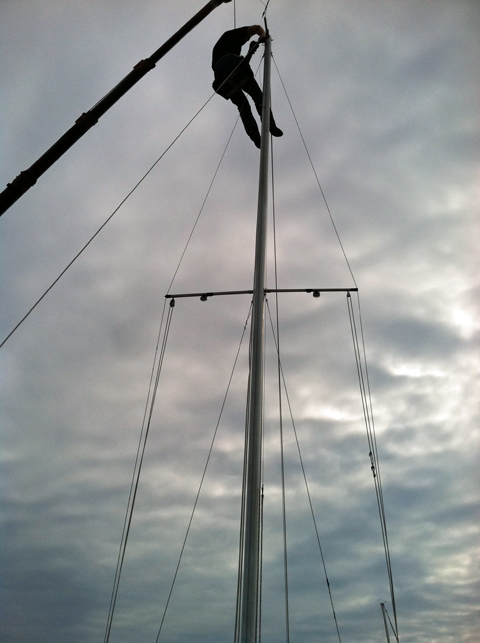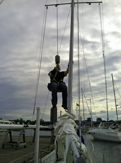 Before leaving for home we had a little time set aside time to take out the sailboat; unfortunately we also had to make a little time to fix a snag in one of the lines. A few weeks back the line for the main sail got away from our partner Nathan and went straight to the top. There is only one way to get it down and I was not volunteering. It’s a good thing I’m married to such a brave man. He was willing to strap into a little harness and get hoisted by a crane to the top of the mast! I took these shots while safely seated on the deck.
