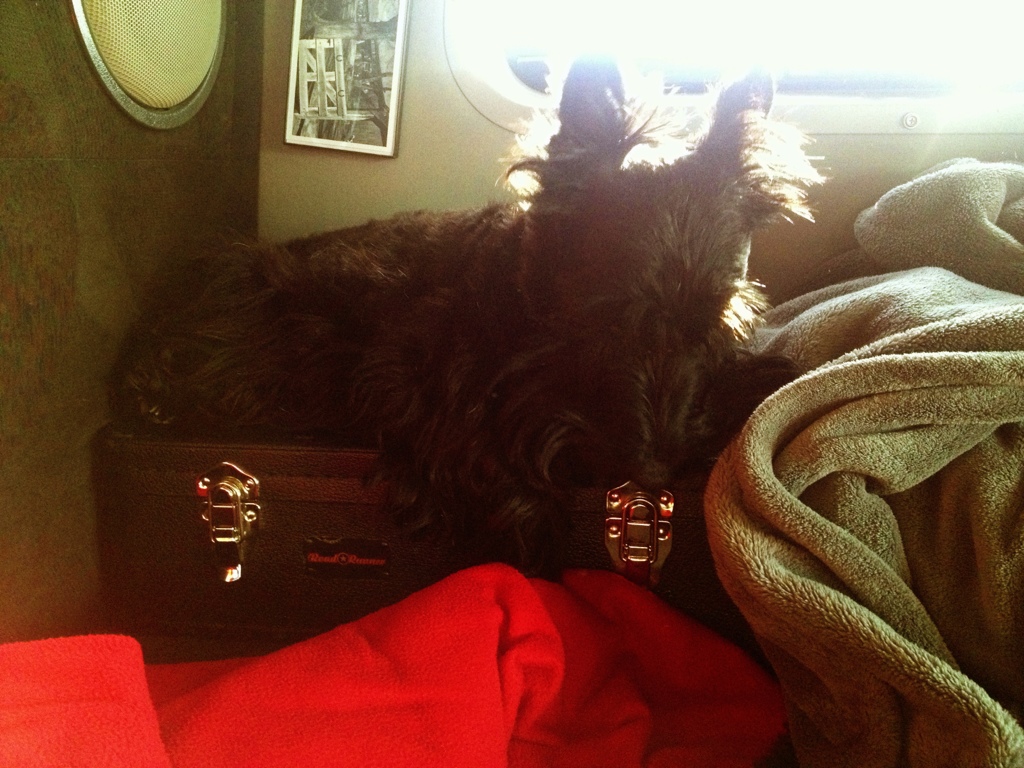 Pippi has a fully little habit of laying in or on Josh’s guitar case. Notice that she has forgone the pile of blankets and pillows for a slightly “higher” vantage point. Funny little Scottie.
