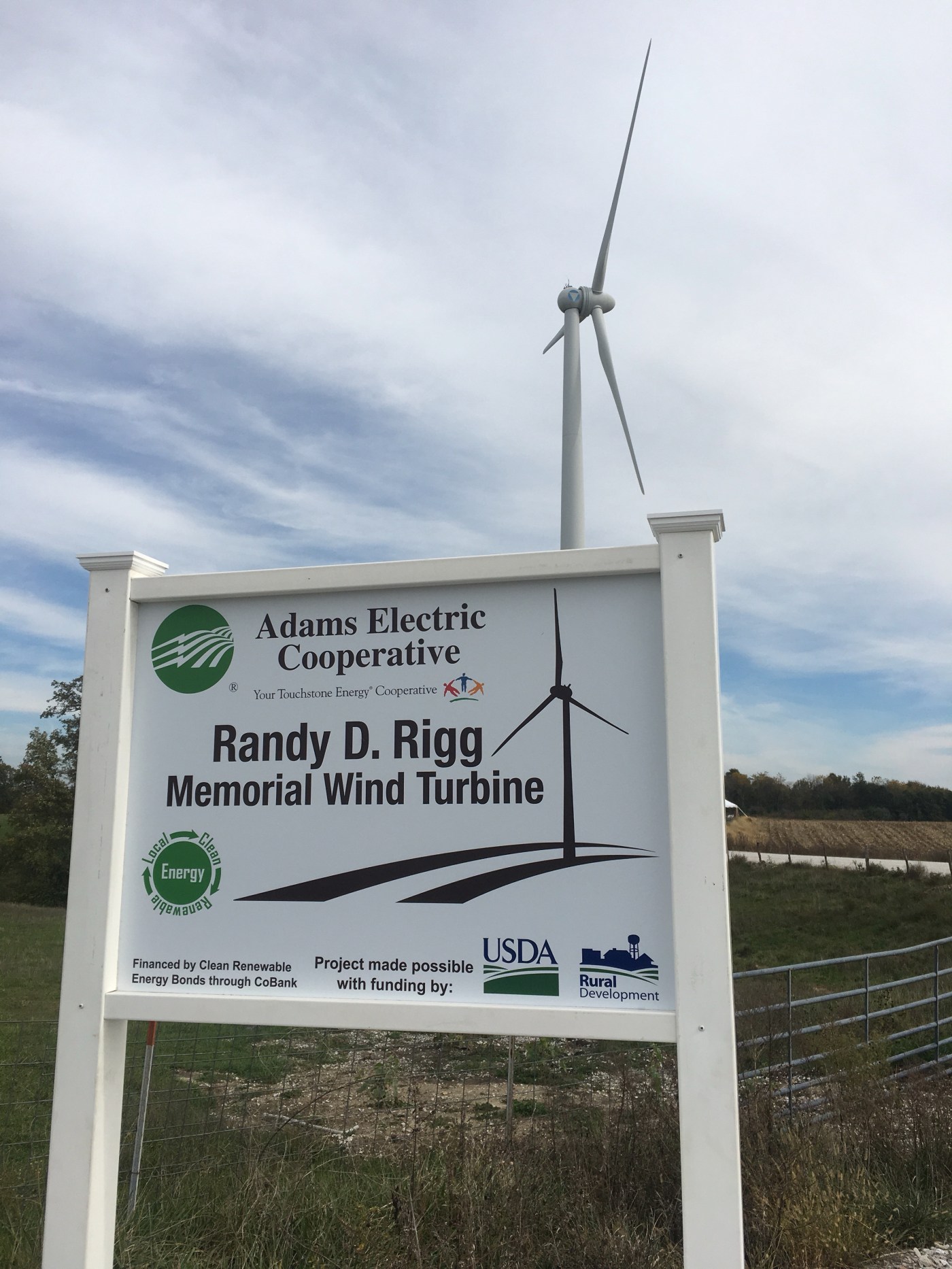 It is inscribed as follows: ” Randy D. Rigg Memorial Wind Turbine named in loving memory of our dear friend and trusted co-worker. This wind turbine stands in tribute to Randy Rigg and his 27 years of dedicated service to Adams Electric Cooperative. As we look heavenward and see the blades spinning on this incredible machine, we are mindful of Randy’s hard work, high standards, and perseverance that helped make this dream a reality. Randy’s legacy will live on as long as the wind blows. Presented by the employees and directors of Adams Electric Cooperative. October 20, 2017.”